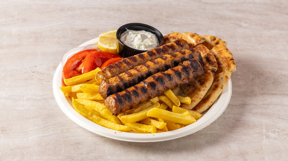 Συνοδεύεται από πατάτες τηγανητές , πίτα, ντομάτα, κρεμμύδι και σως της επιλογής σου