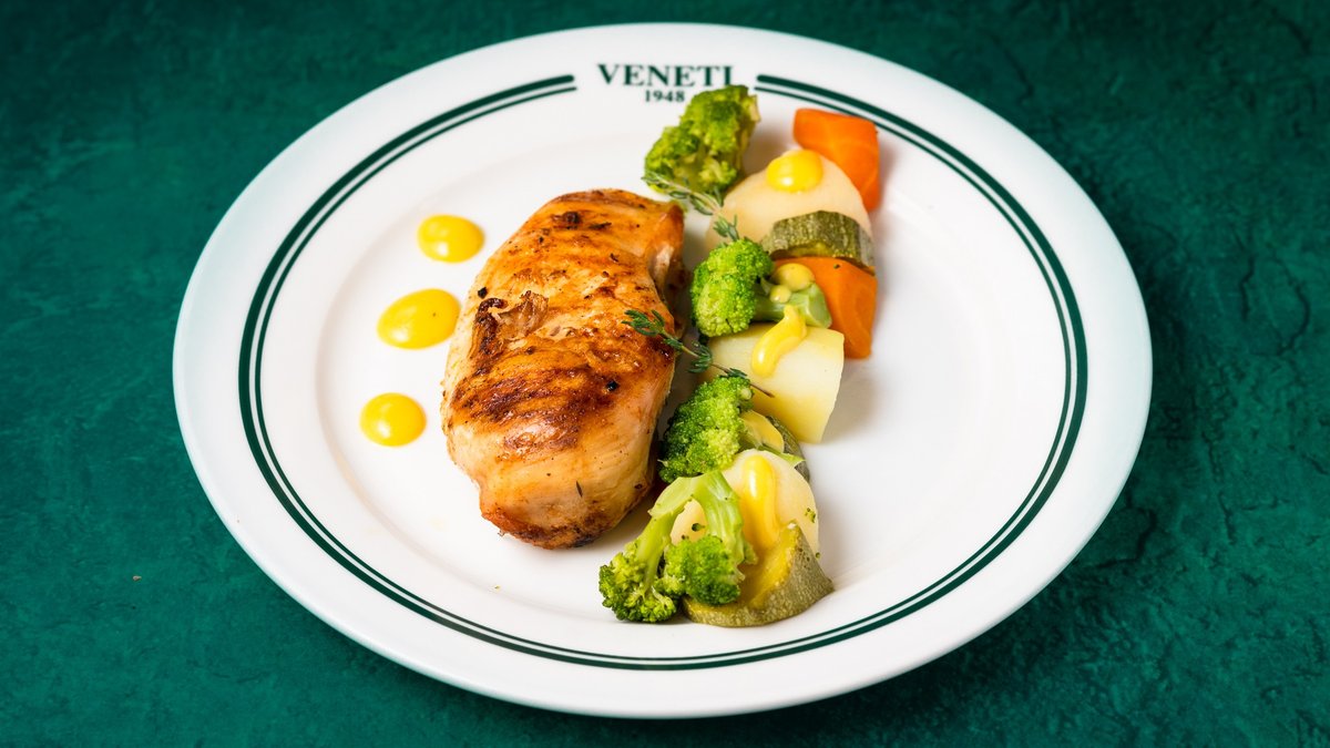 Φρέσκο φιλέτο στήθος κοτόπουλο, ψημένο στη σχάρα με λαδολέμονο. Συνοδεύεται από βραστά λαχανικά (πατάτα, κολοκύθι, καρότο, μπρόκολο) με σάλτσα λαδολέμονο