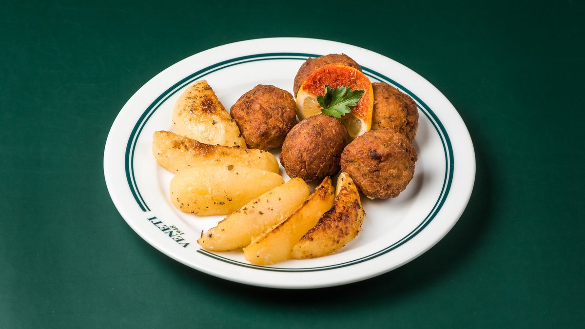 Κεφτεδάκια από φρέσκο μοσχαρίσιο κιμά και μυρωδικά. Συνοδεύονται από πατάτες φούρνου