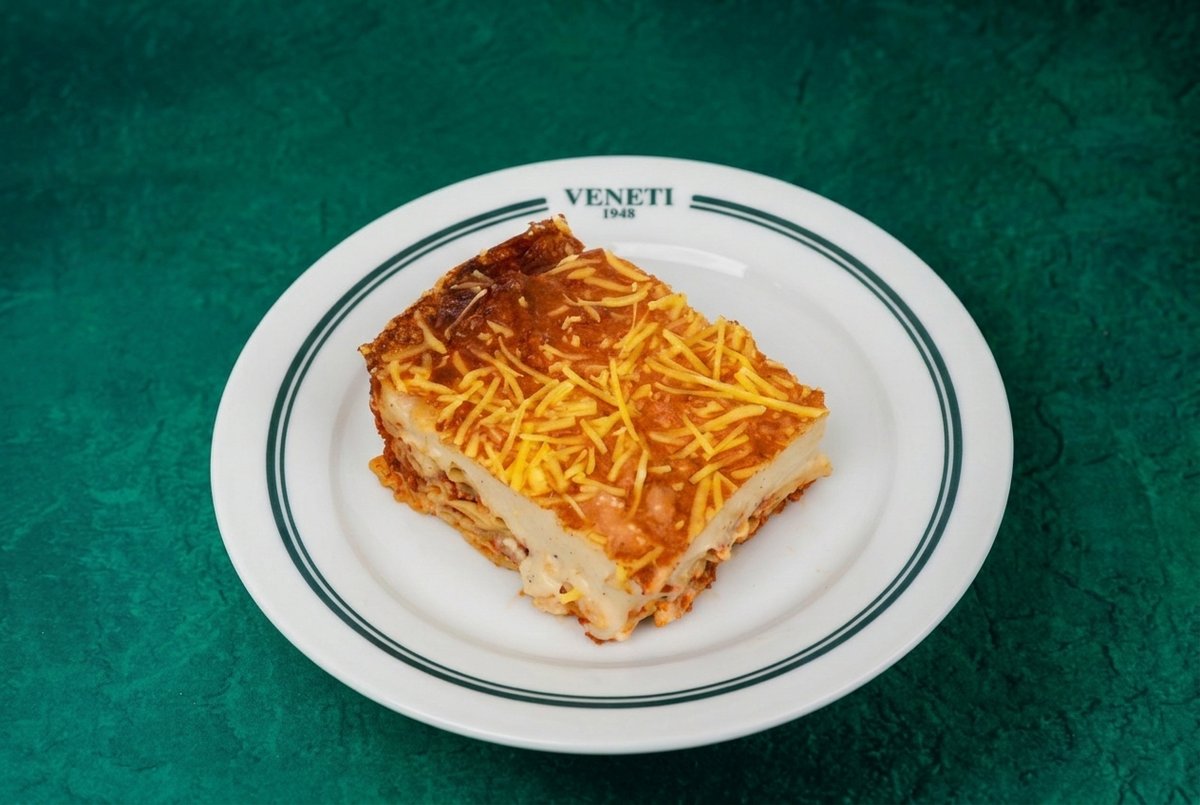 Με χειροποίητη μπεσαμέλ από φυτικό γάλα, ζυμαρικά και σιγομαγειρεμένο κιμά σόγιας με σάλτσα ντομάτας και μυρωδικά.
