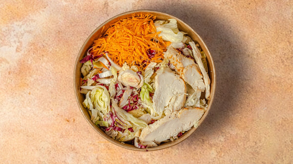 Σαλάτα με iceberg, καρότο, κόκκινο λάχανο, ντοματίνια, κοτόπουλο και σως μαγιονέζας