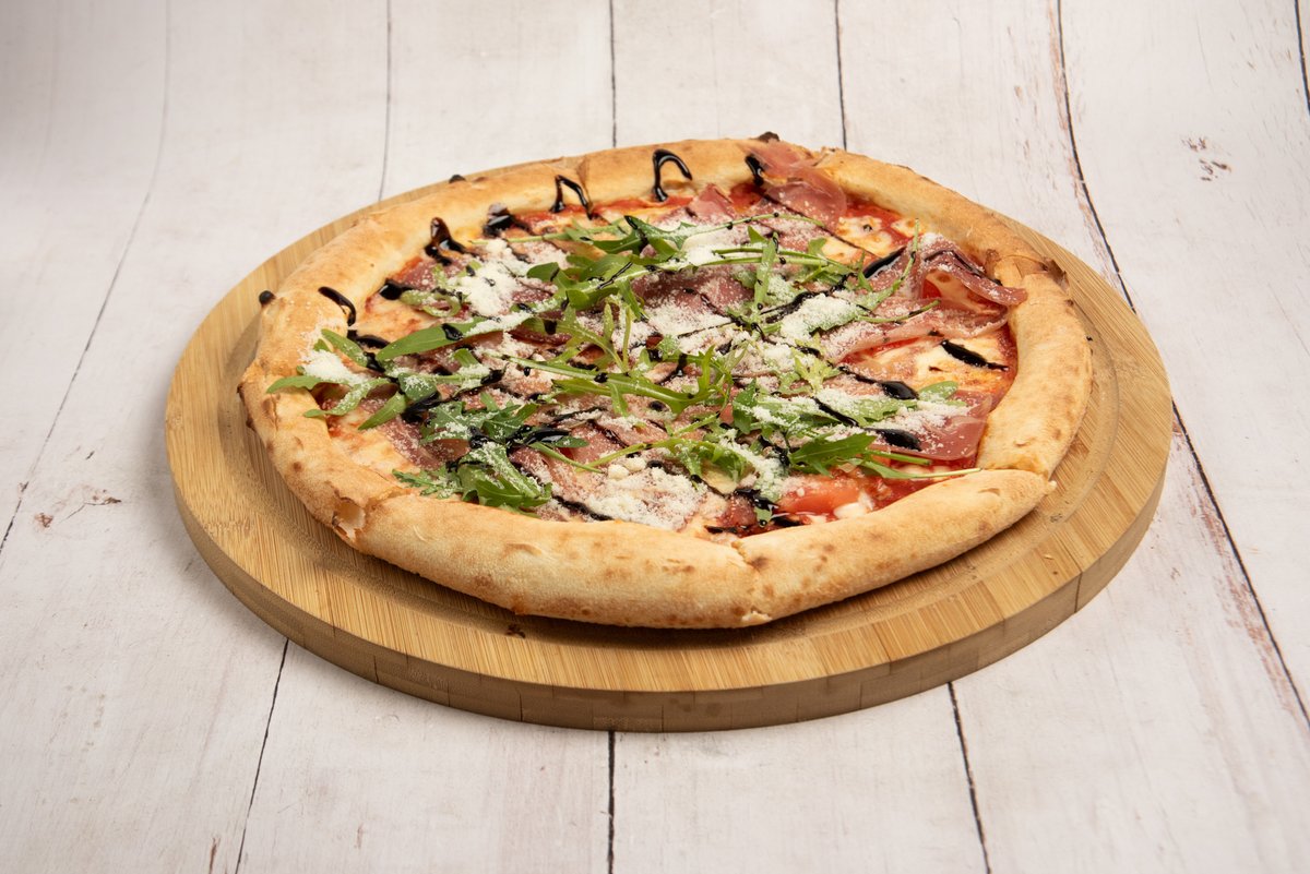 6 κομμάτια. Σάλτσα ντομάτας San Marzano, φρέσκια ντομάτα, φρέσκια mozzarella, prosciutto crudo Parma 24μηνης ωρίμανσης, ρόκα, φρεσκοτριμμένο parmigiano reggiano και κρέμα balsamico