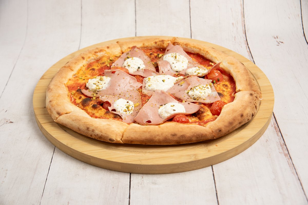 8 κομμάτια. Σάλτσα ντομάτας San Marzano, βουβαλίσια μπουράτα, ντοματίνια, μορταδέλλα και φυστίκι Αιγίνης