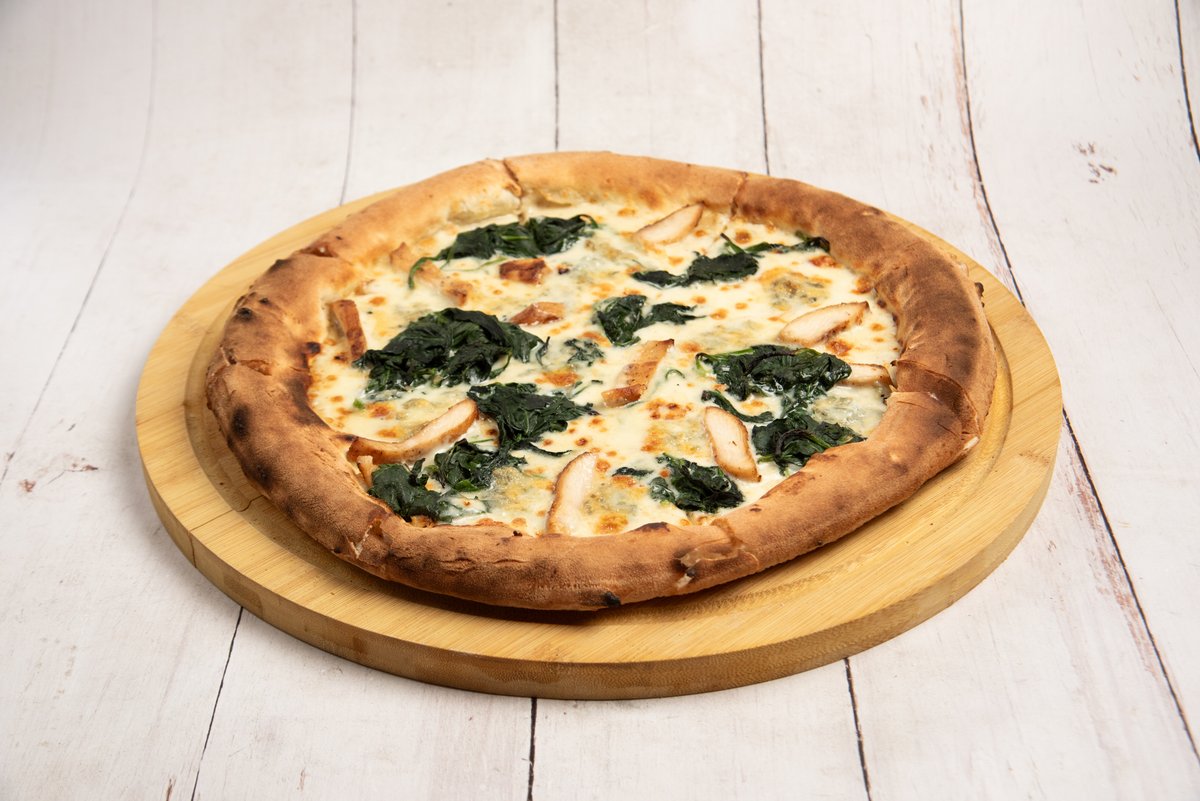 8 κομμάτια. Φρέσκια mozzarella, ricotta, gorgonzola, dolce, parmigiano Reggiano, φιλέτο από κοτόπουλο, σπανάκι
