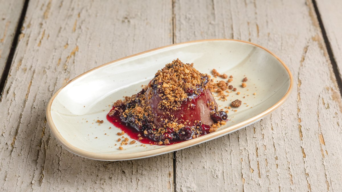 Kαραμελωμένο αχλάδι, μους τυριού gorgonzola, juice μοσχάρι και τριμμένο μπισκότο amaretti