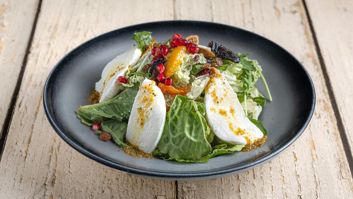 Πράσινη σαλάτα με αγελαδινή φρέσκια mozzarella, αποξηραμένα ανάμεικτα φρούτα, φιλέτο πορτοκάλι, ρόδι, καρύδια και vinaigrette εσπεριδοειδών