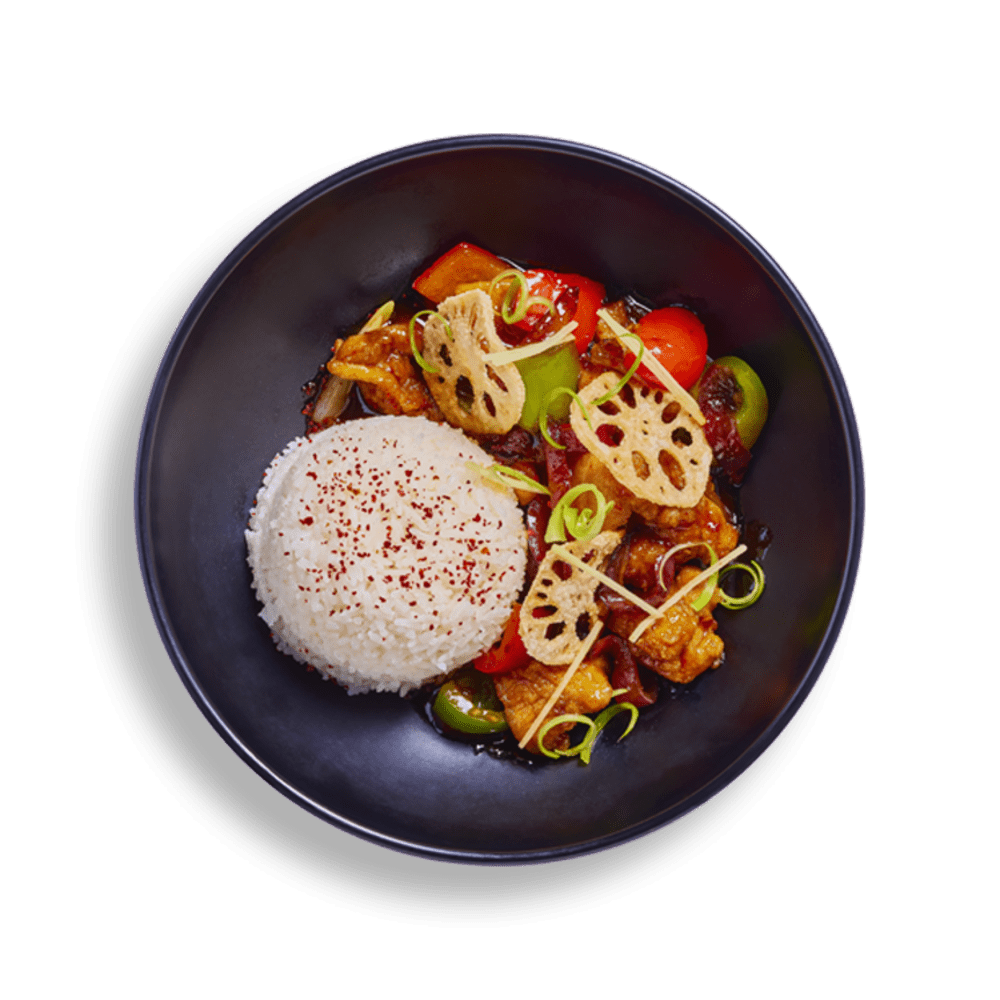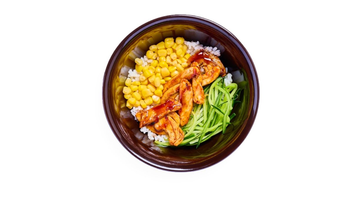 Ρύζι με κοτόπουλο, καλαμπόκι, αγγούρι, γλυκιά σάλτσα