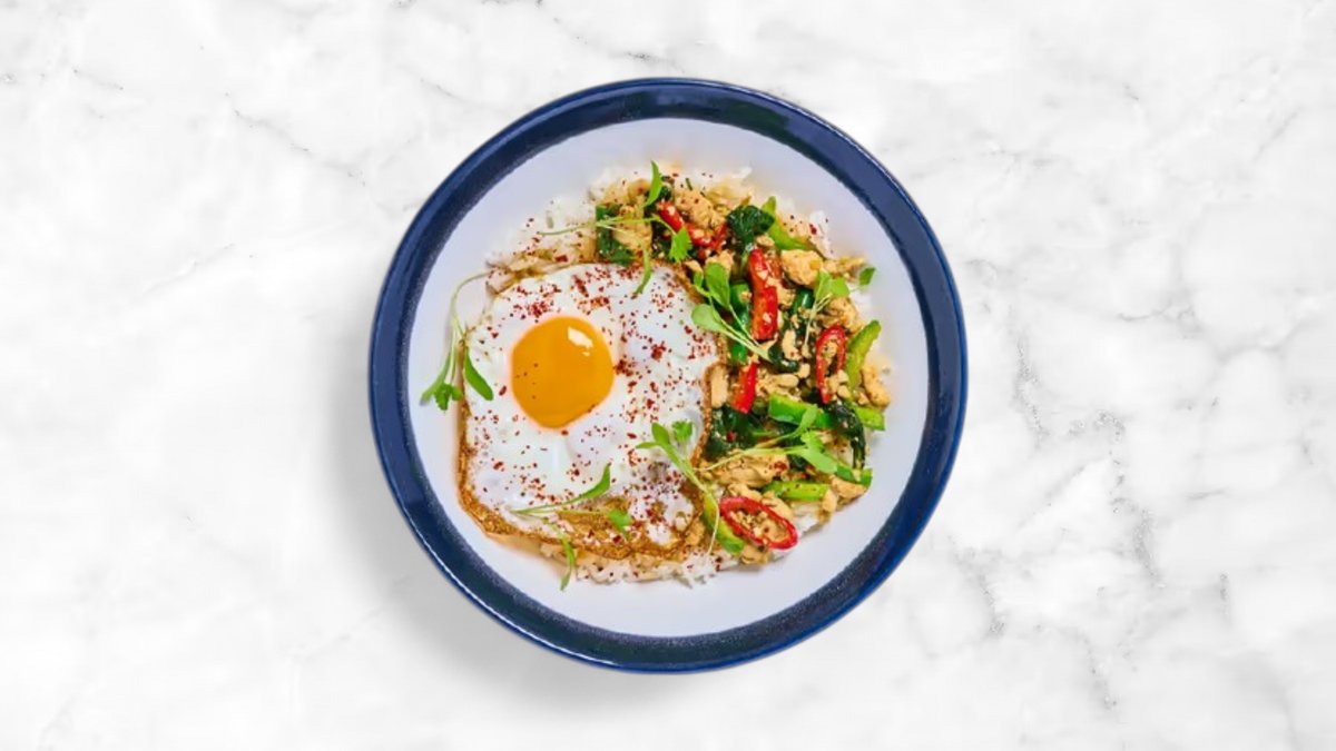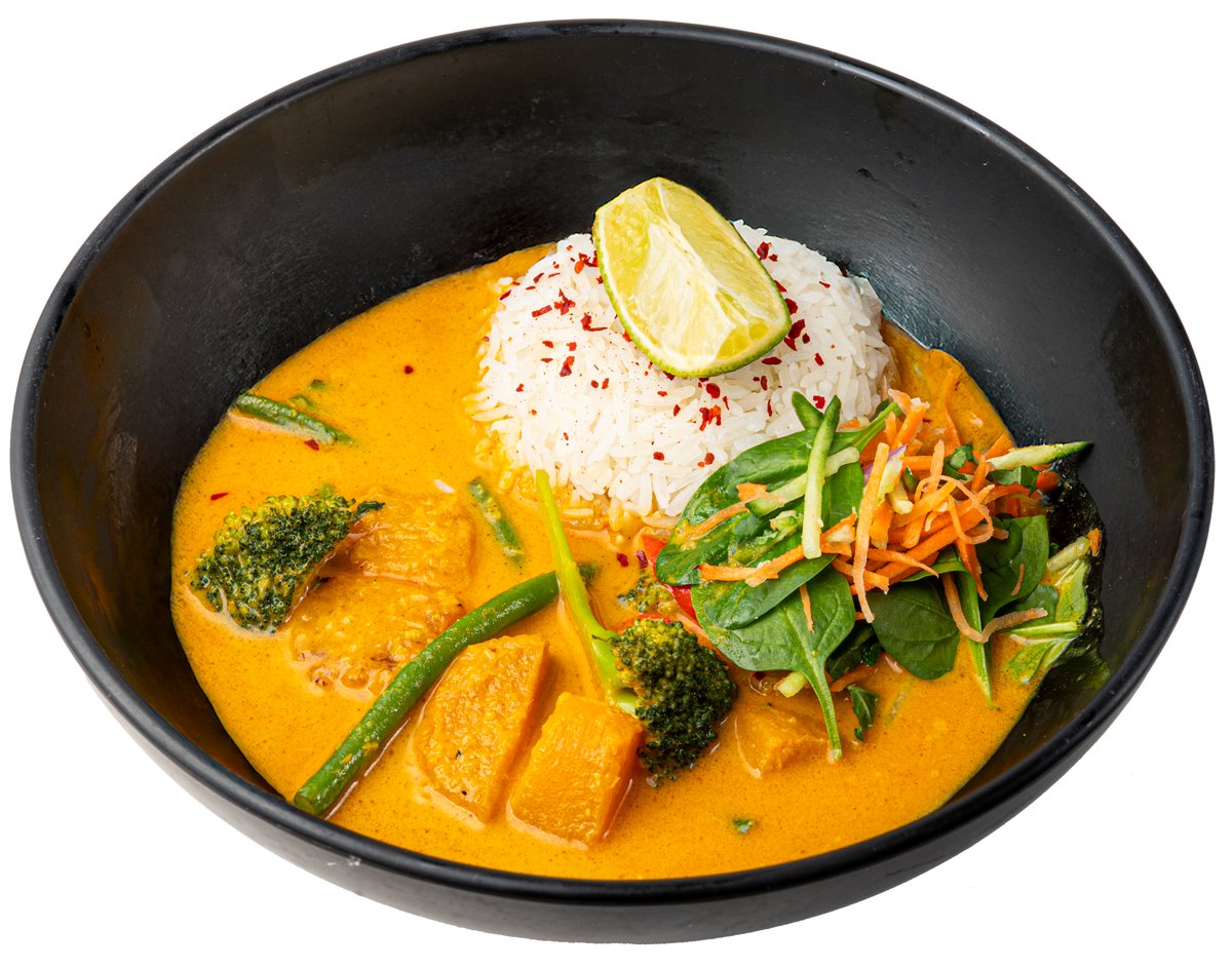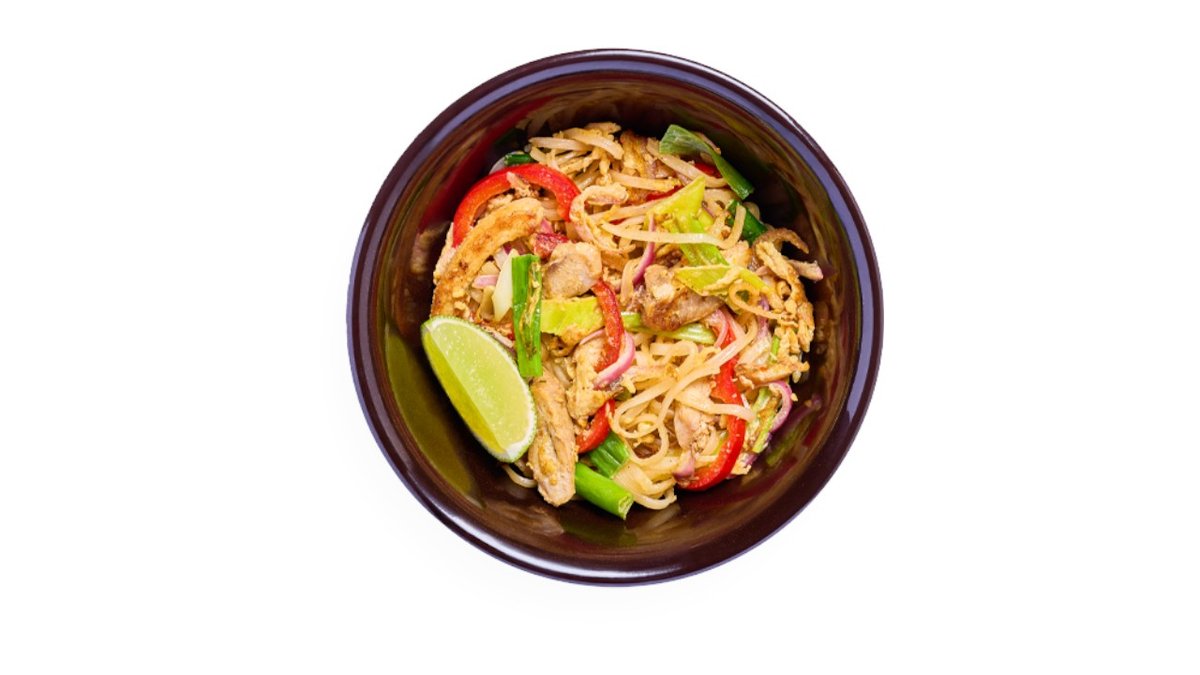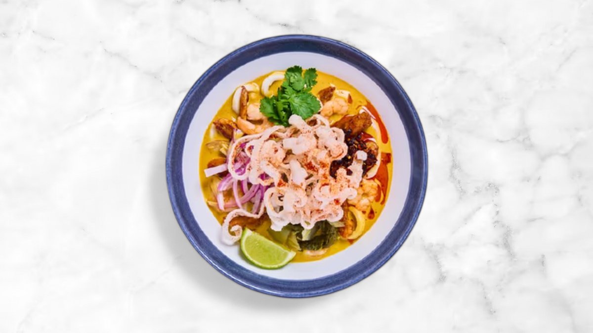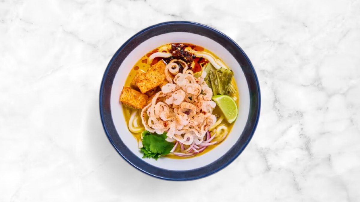 Στήθος κοτόπουλο με ramen noodles μέσα σε πικάντικο ζωμό από κοτόπουλο. Γαρνίρεται με κρεμμύδι, βλαστάρια φασολιών σόγας, κόλιανδρο, φρέσκο κρεμμυδάκι, chillies και μια φέτα λάιμ