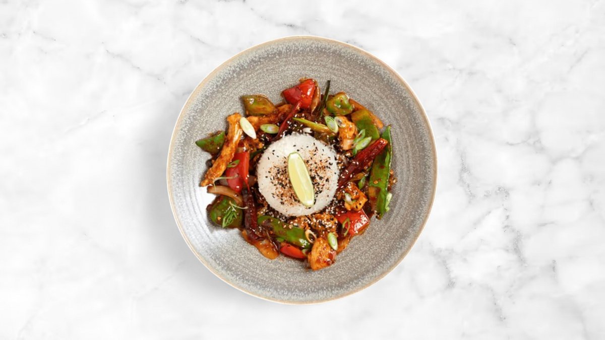 Vegetarian. Τραγανό κουνουπίδι στο γουόκ με σάλτσα firecracker, κόκκινο κρεμμύδια, πράσινα κρεμμύδια, κόλιανδρο και φρέσκο τζίντζερ