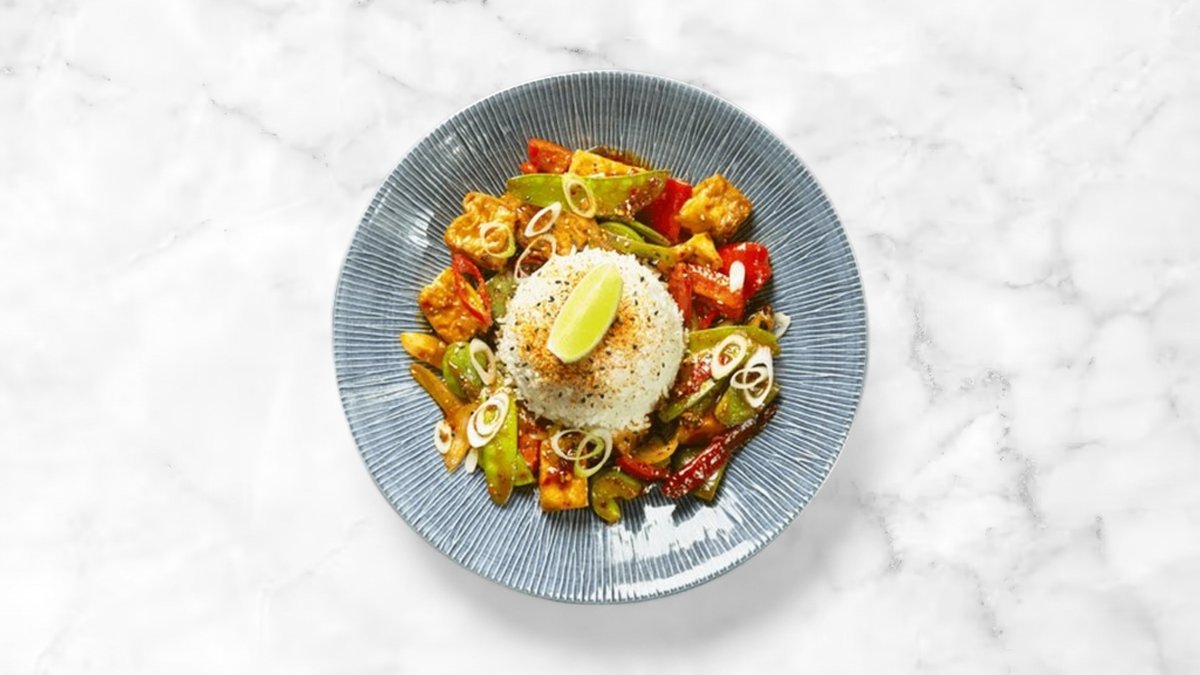 Ρύζι με tofu, καλαμπόκι, αγγούρι, γλυκιά σάλτσα