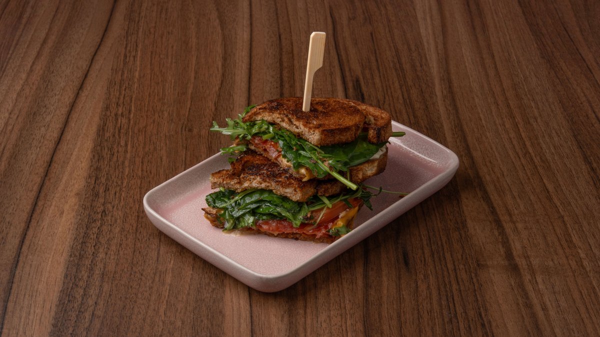 Ζεστό sandwich με χωριάτικο ψωμί, cheddar, white cream sauce, σαλάμι αέρος, chorizo, ζαμπόν fouantre, ρόκα & ντομάτα