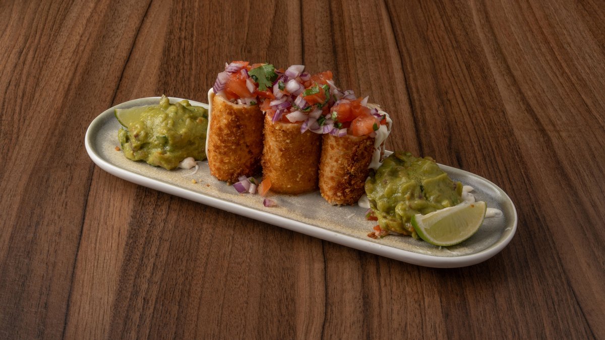Τραγανά ρολάκια γεμιστά με σιγομαγειρεμένο brisket, mozzarella, white cream sauce, guacamole & pico de gallo