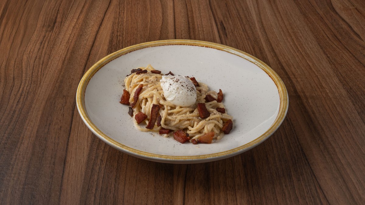 Αλμυρές αυγόφετες με ψωμάκι milkbread, σάλτσα καρμπονάρας, καραμελωμένο bacon και μανιτάρια, σχοινόπρασο & τριμμένο πιπέρι