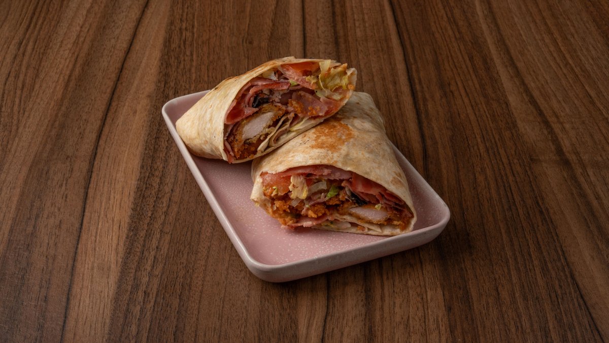Τορτίγια με κοτόπουλο πανέ, bacon, cheddar, iceberg, ντομάτα & spicy wrap sauce