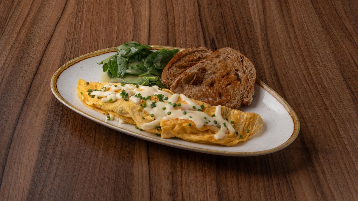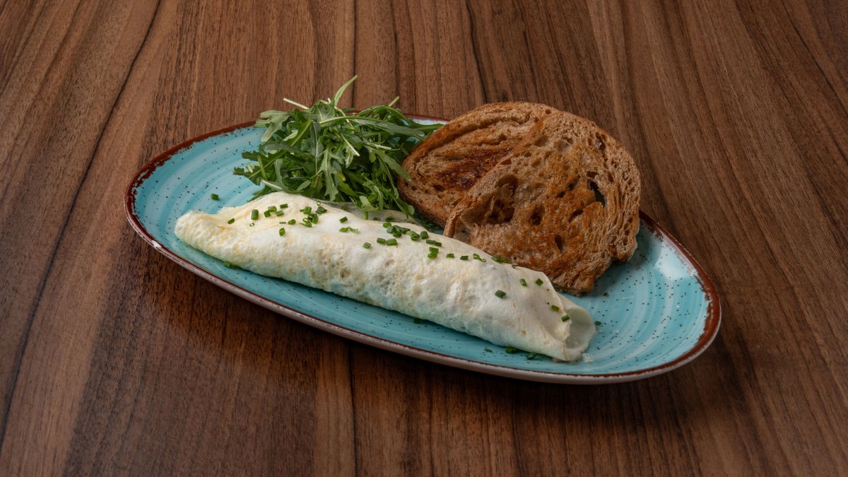 Mε τρία αυγά, mozzarella, bacon, μανιτάρια, πράσινη πιπεριά, σχοινόπρασο & αρωματικό λάδι. Συνοδεύεται με φρυγανισμένο ψωμάκι ολικής & σαλάτα