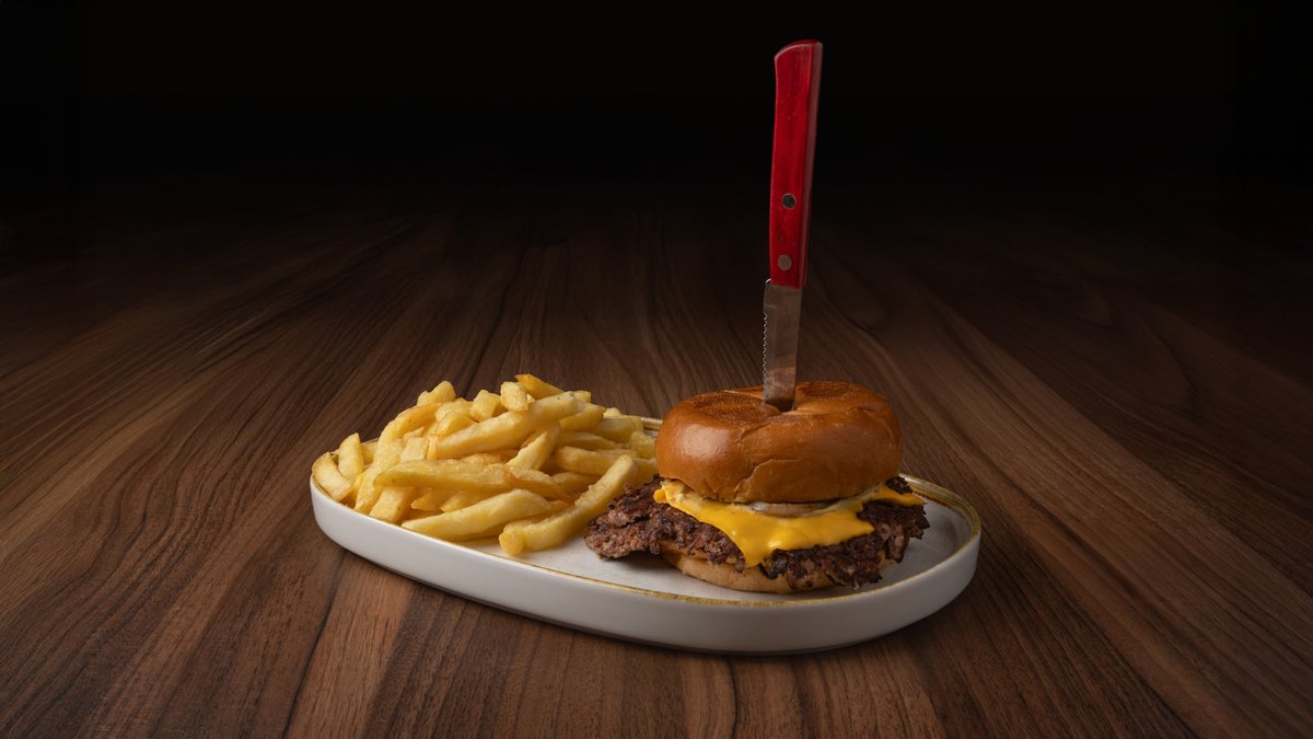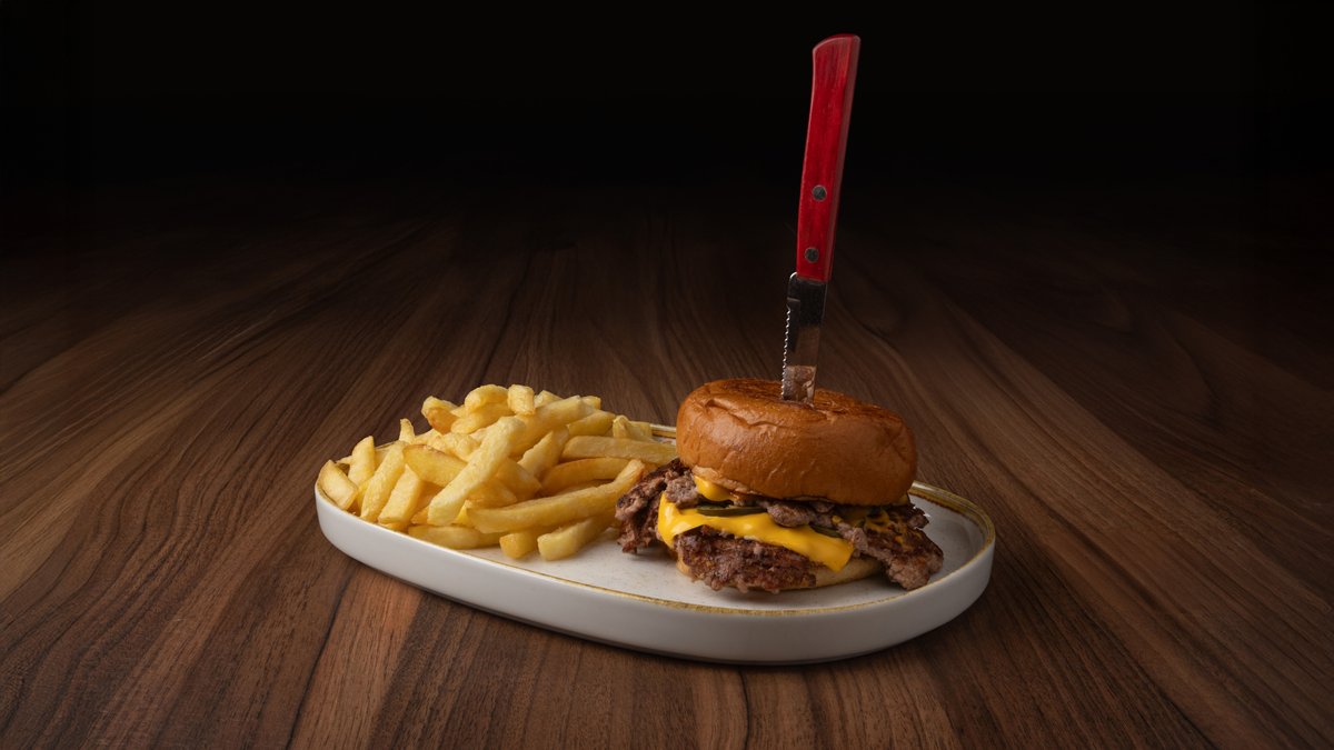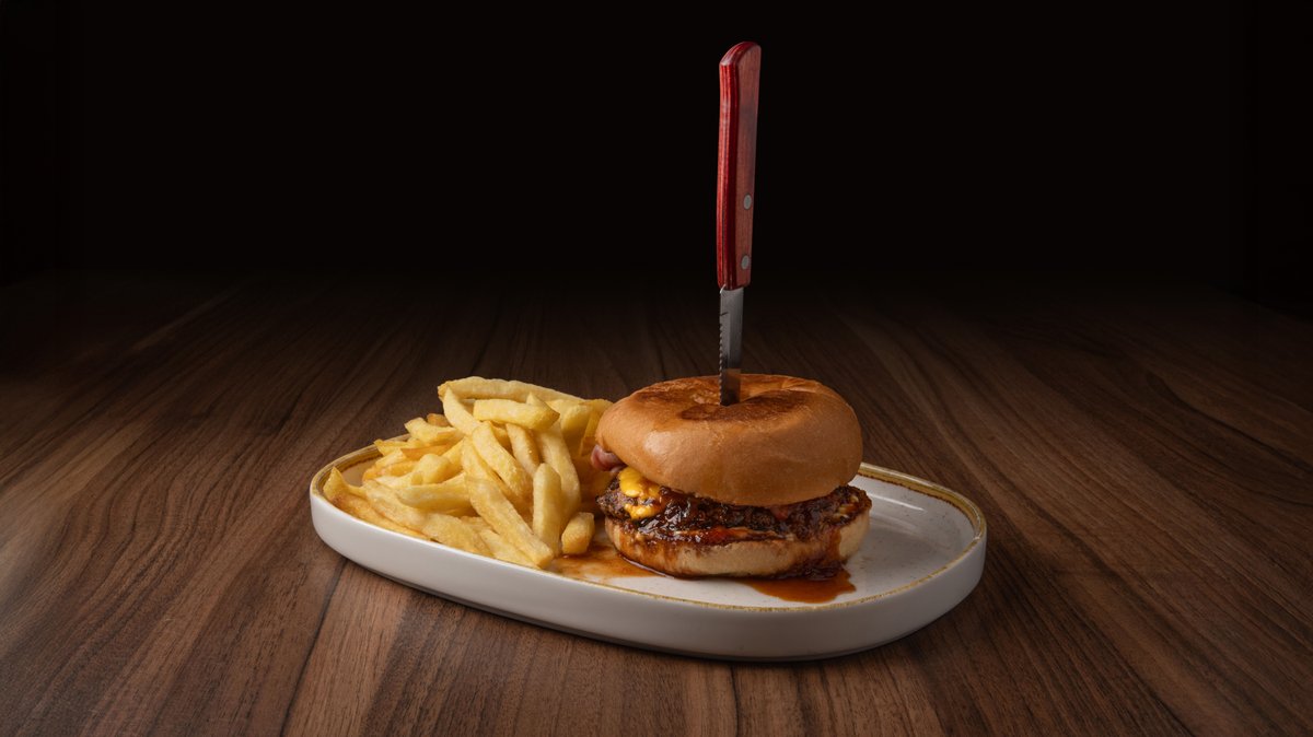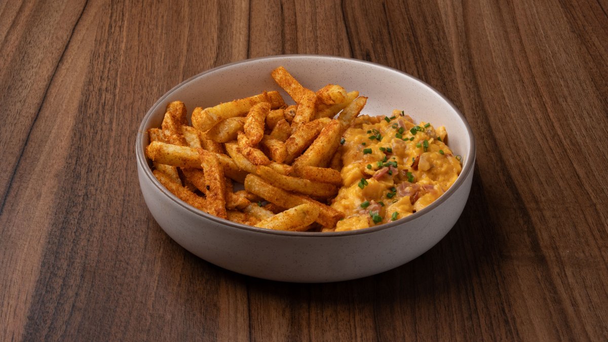 Με καπνιστό bacon, cheddar, κρεμμύδι, τηγανητές πατάτες με παρμεζάνα & καπνιστή πάπρικα Το λουκάνικο δεν περιλαμβάνεται, προστίθεται προαιρετικά με έξτρα χρέωση.