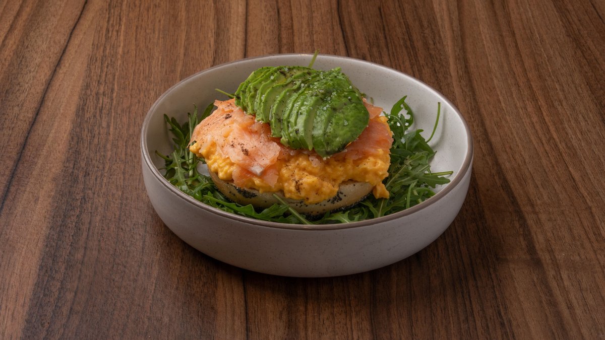 Αυγά scrambled πάνω σε bagel, καπνιστός σολομός, αβονάντο & ρόκα