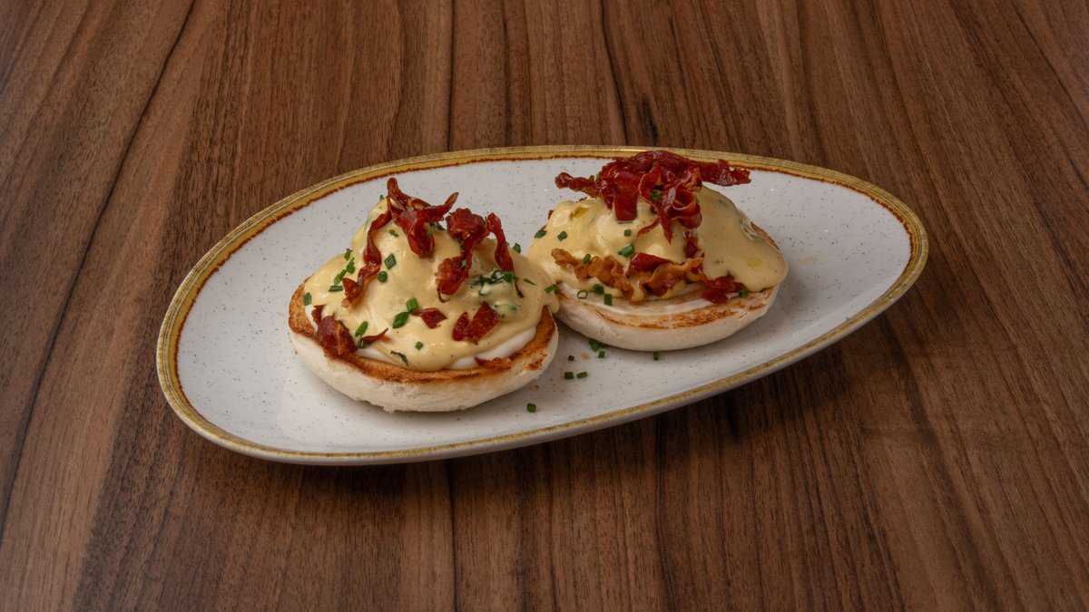 Αυγά ποσέ πάνω σε english muffin, σπανάκι σωτέ, chips προσούτο, sauce hollandaise, μαγιονέζα & λάδι τρούφας