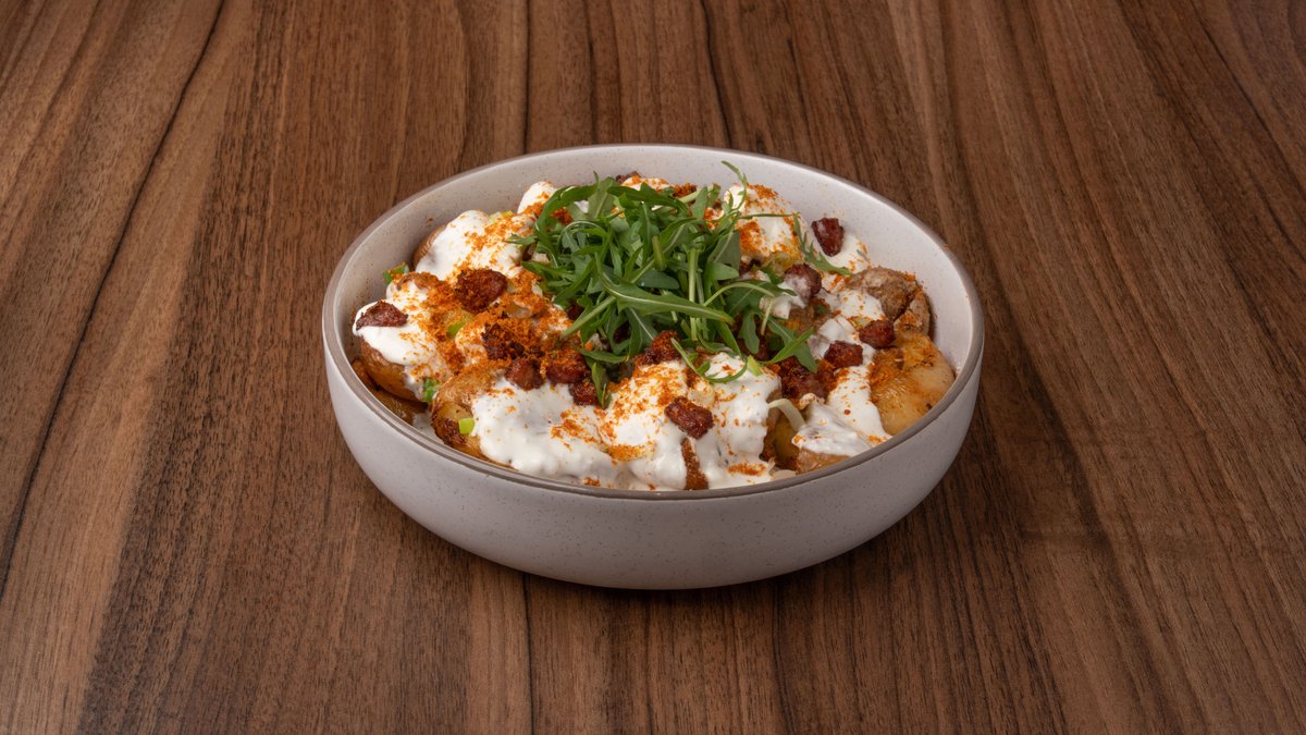 Baby πατάτες, χειροποίητη κρέμα φέτας, λουκάνικο, πάπρικα παρμεζάνας, ρόκα & φρέσκο κρεμμυδάκι