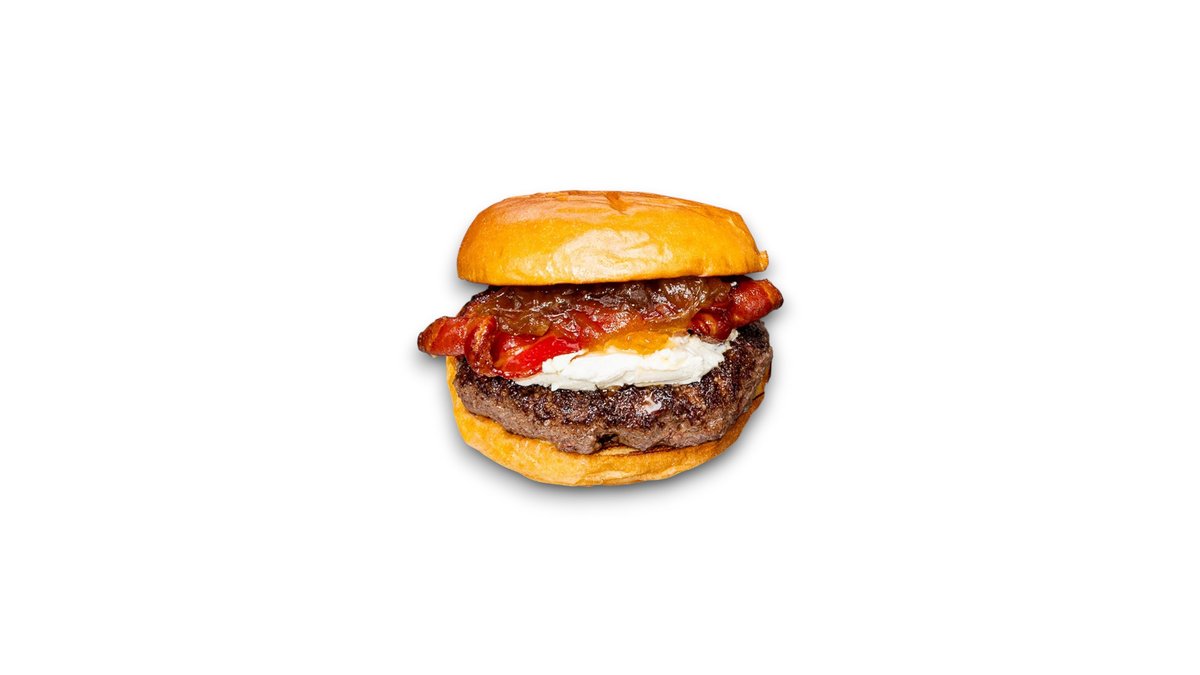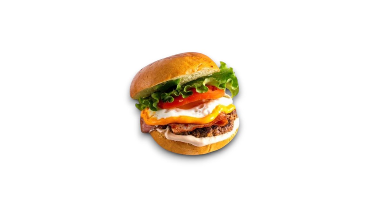 Με μπιφτέκι από 100% μοσχαρίσιο κιμά 180 g, cheddar, ντομάτα, μπέικον, αυγό τηγανητό, μαγιονέζα και bbq sauce