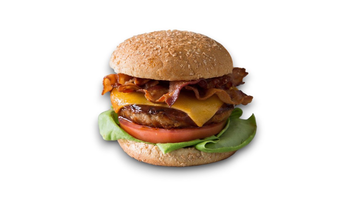 Με μπιφτέκι από 100% μοσχαρίσιο κιμά 180 g, cheddar, μαρούλι, ντομάτα, onion rings, μπέικον, μαγιονέζα και bbq sauce