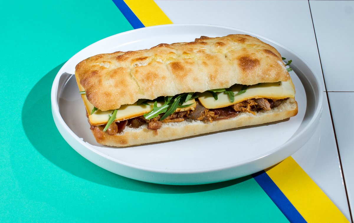 Με κότσι χοιρινό, καπνιστή gouda, chutney κρεμμυδιού, baby ρόκα και wholegrain μουστάρδα