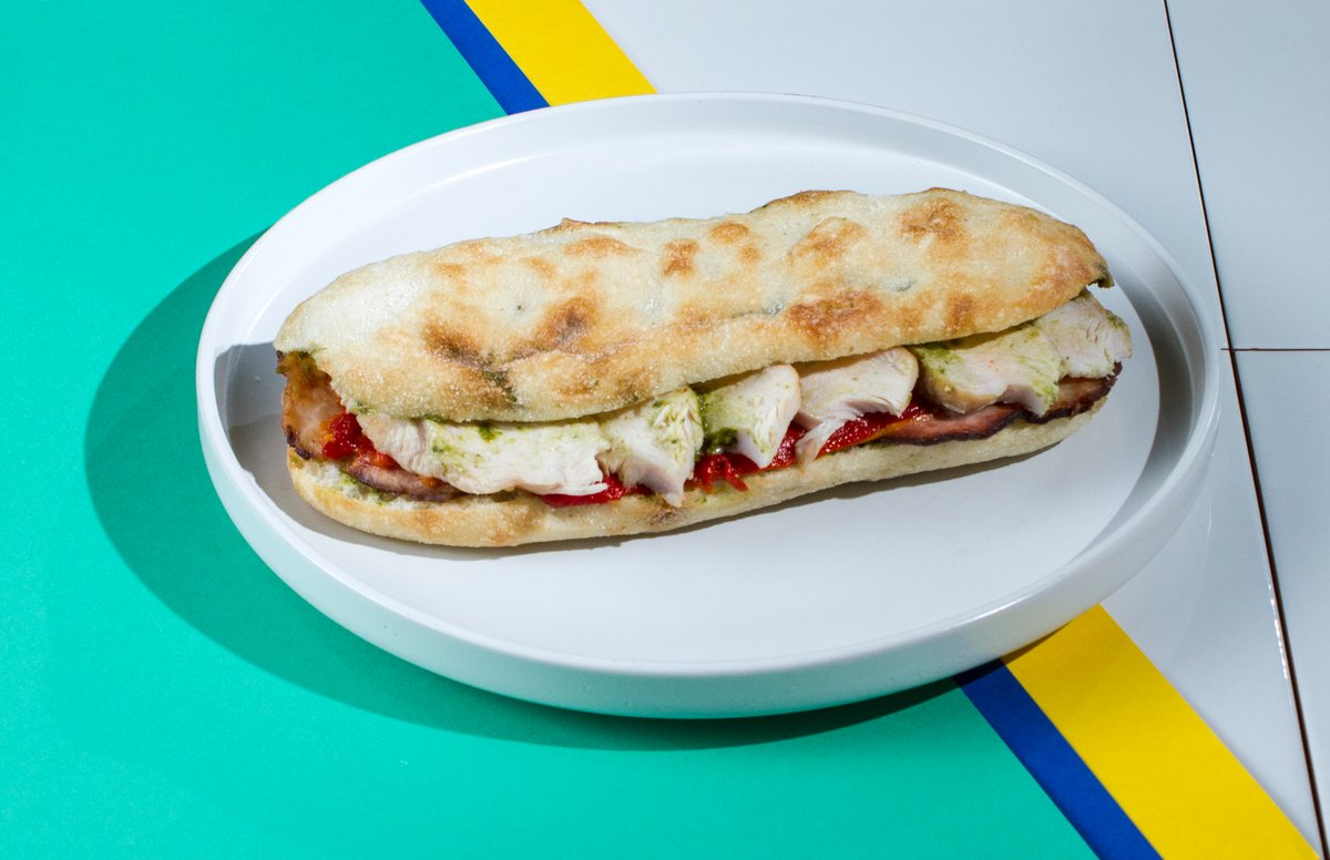 Γαλοπούλα, μπέικον, ψητή πιπεριά Φλωρίνης και χειροποίητο πέστο βασιλικού σε ψωμάκι panini