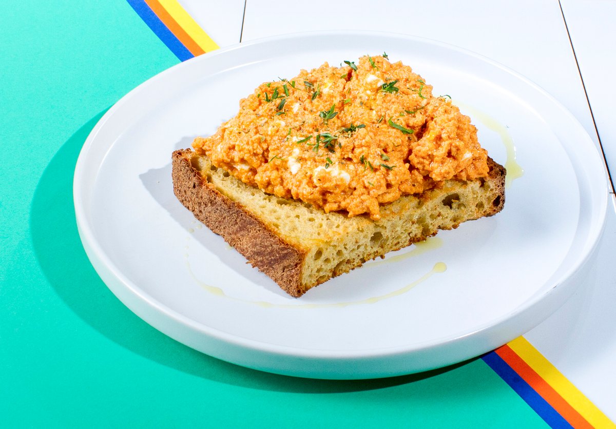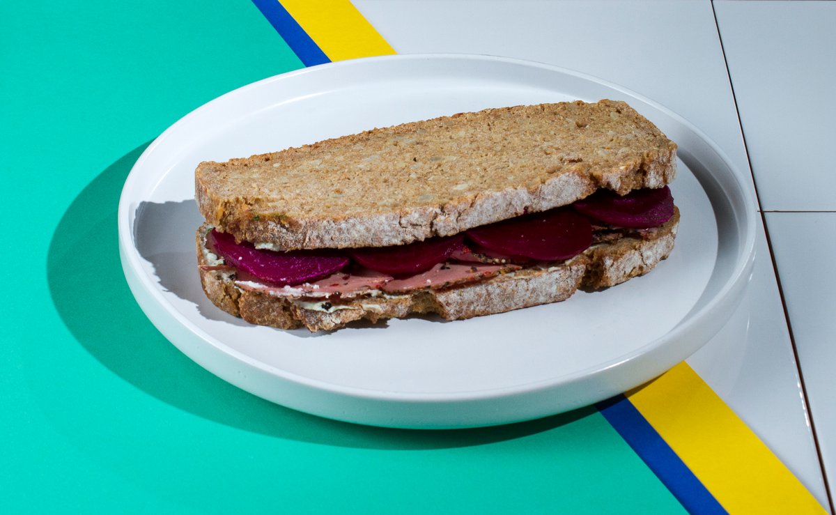 Παστράμι, κρέμα κατσικίσιου τυριού, πικάντικο μέλι και χειροποίητη πίκλα από παντζάρι σε dinkel bread