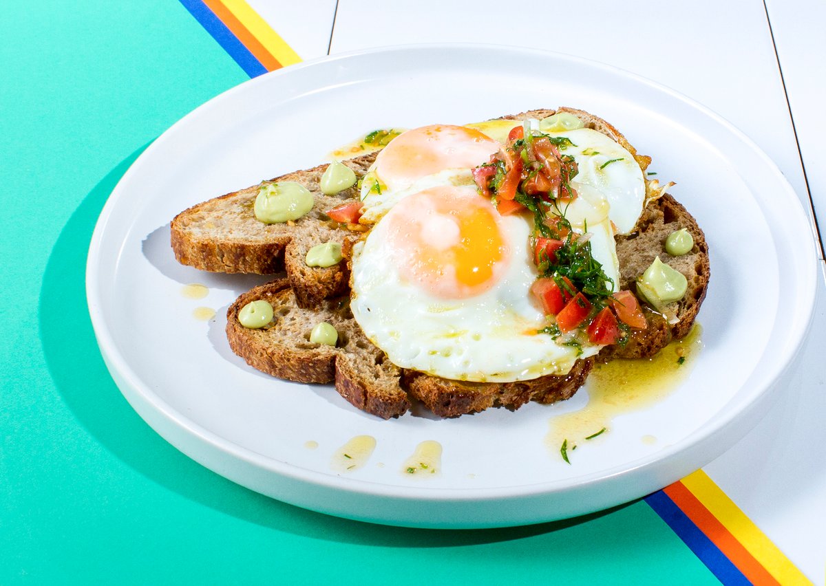 Αυγά μάτια με ντοματίνια, μυρωδικά και κρέμα αβοκάντο συνοδεύεται με φρυγανισμένο ψωμί ολικής
