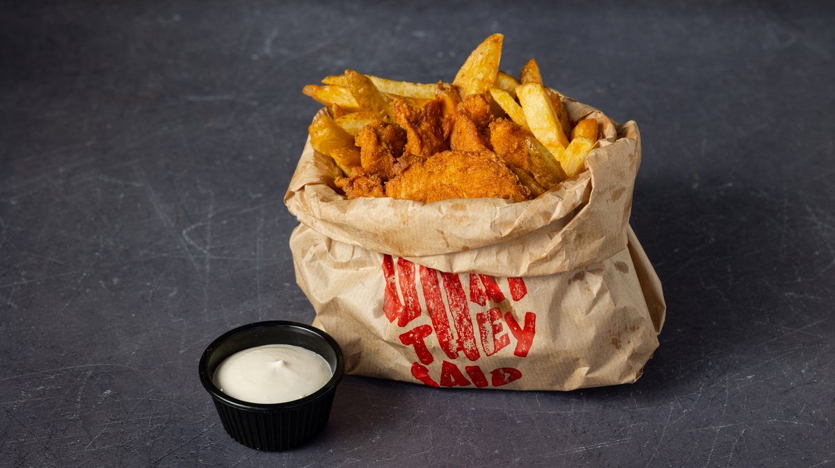Με τραγανό κοτόπουλο και μπαχαρικά. Συνοδεύεται από πατάτες τηγανητές και garlic mayo