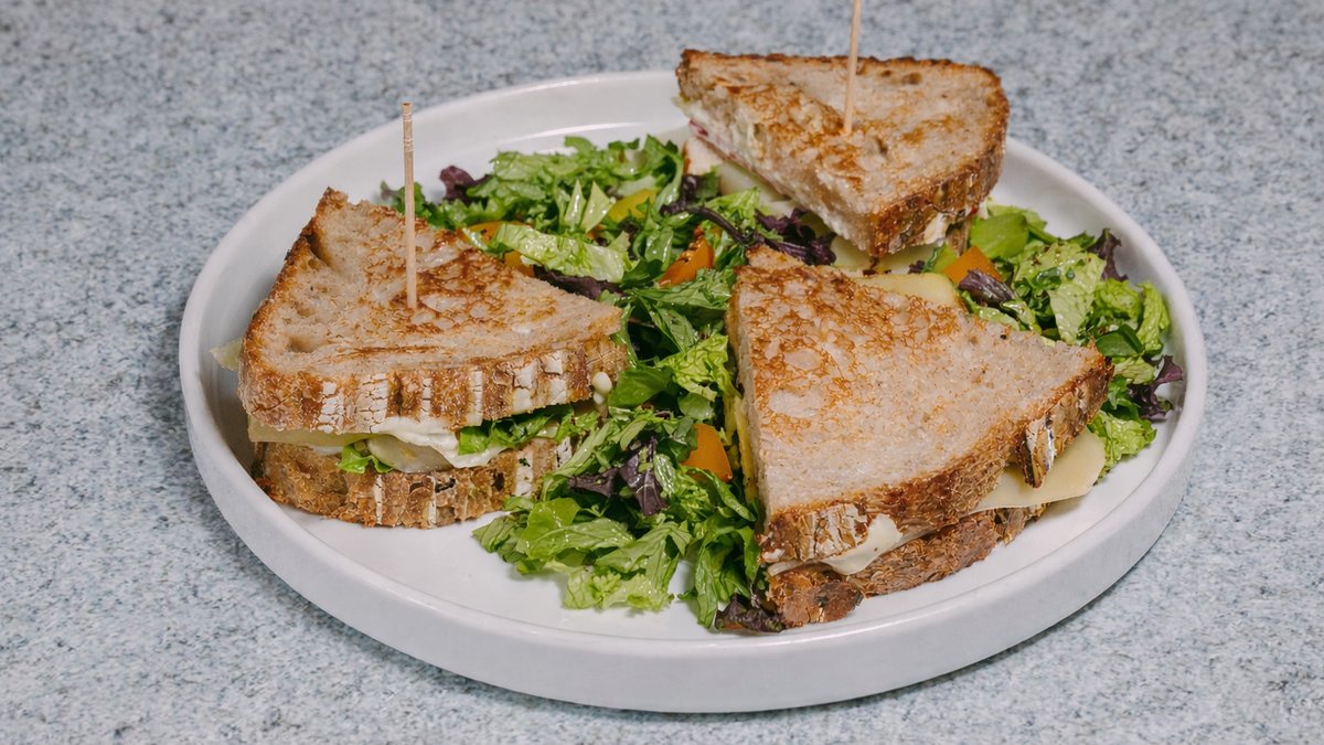 Πανινι με γραβιέρα cream cheese, μαρμελάδα τομάτας, ρόκα σαλάτα και house dressing