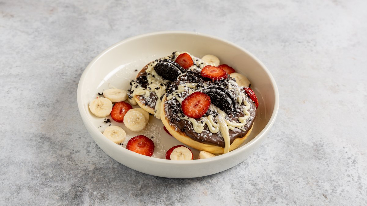 Pancake με πραλίνα φουντουκιού, πραλίνα λευκής σκοκολάτας, μπισκότο oreo κκαι φρέσκια μπανάνα ή φράουλα