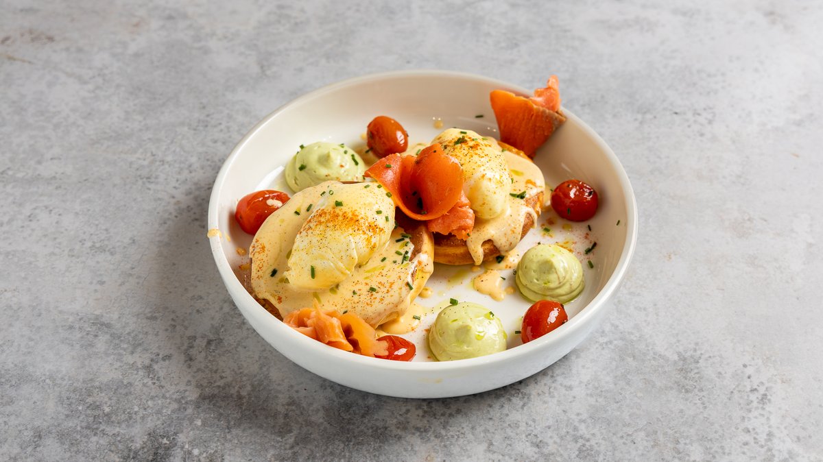 Pancake με καπνιστό σολομό, αυγό ποσέ, τοματίνια κονφί, sauce hollandaise και μους αβοκάντο