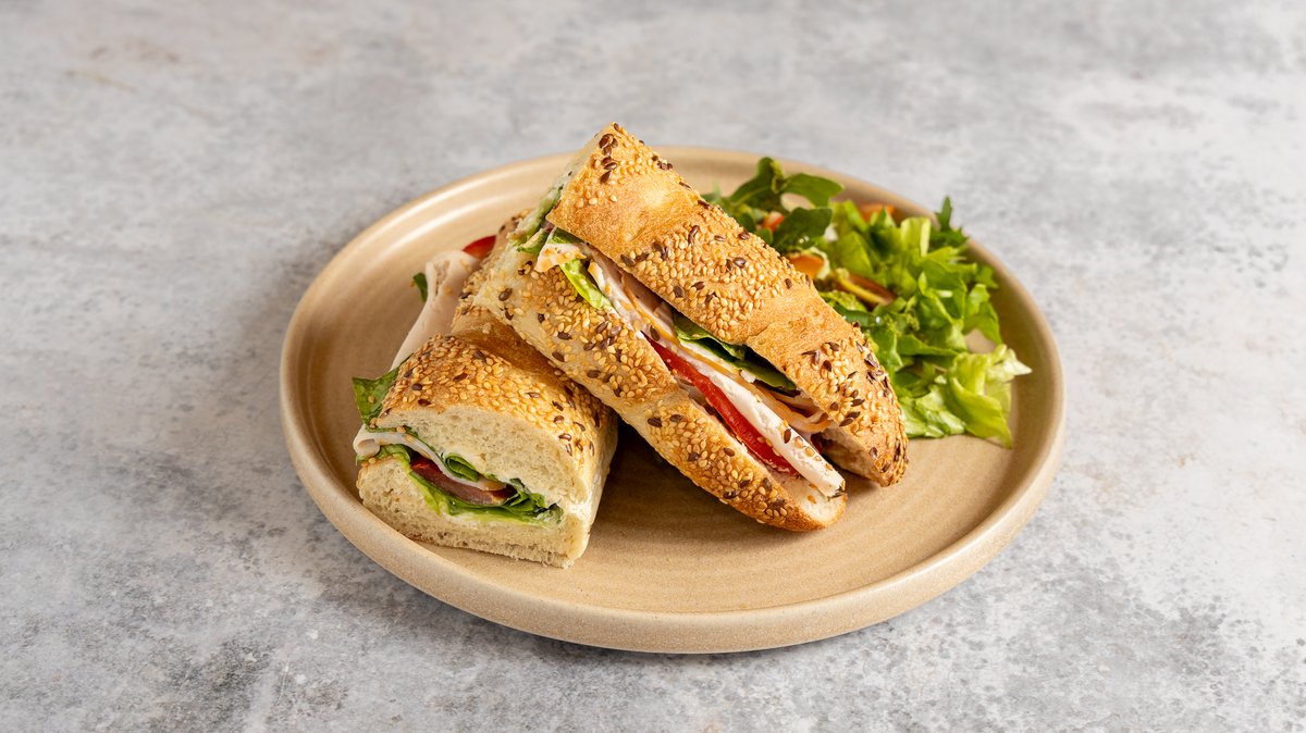 Μπαγκέτα χειροποίητη με κρέμα τυριού philadelphia, γαλοπούλα, γαλλικό μαρούλι, ντομάτα και σως μαγιονέζας