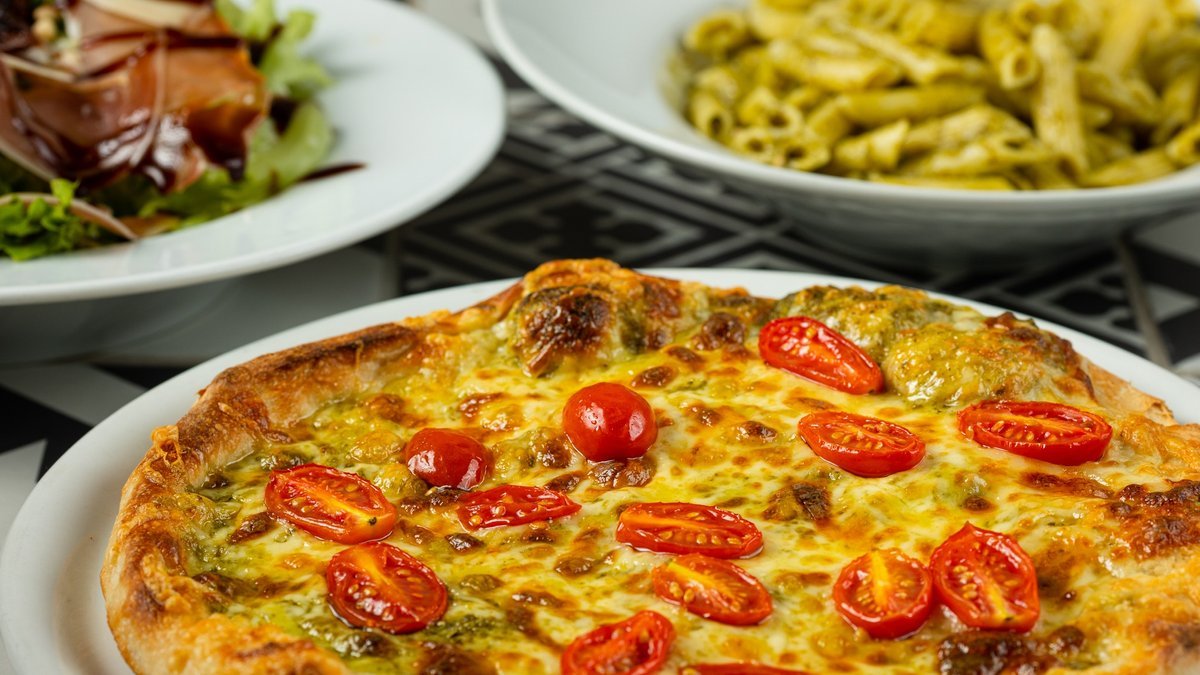 Με πέστο βασιλικού, mix τυριών (gouda, edam και μοτσαρέλα), μανιτάρια, ντομάτα, πιπεριά, κρεμμύδι, καλαμπόκι και κάππαρη