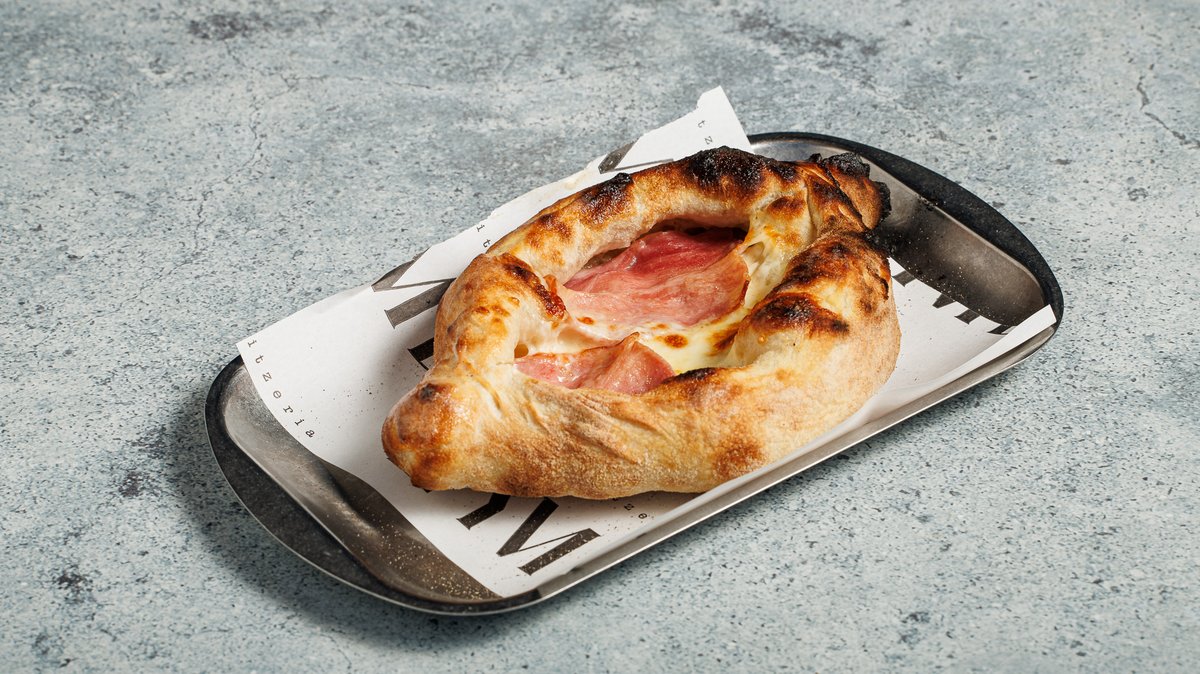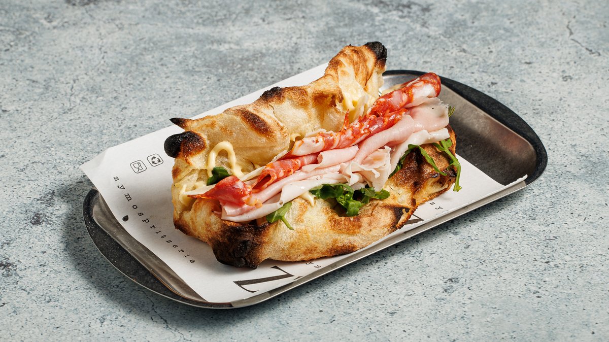 Με proscuitto cotto, mascarpone, ρόκα, mozzarella και ντομάτα