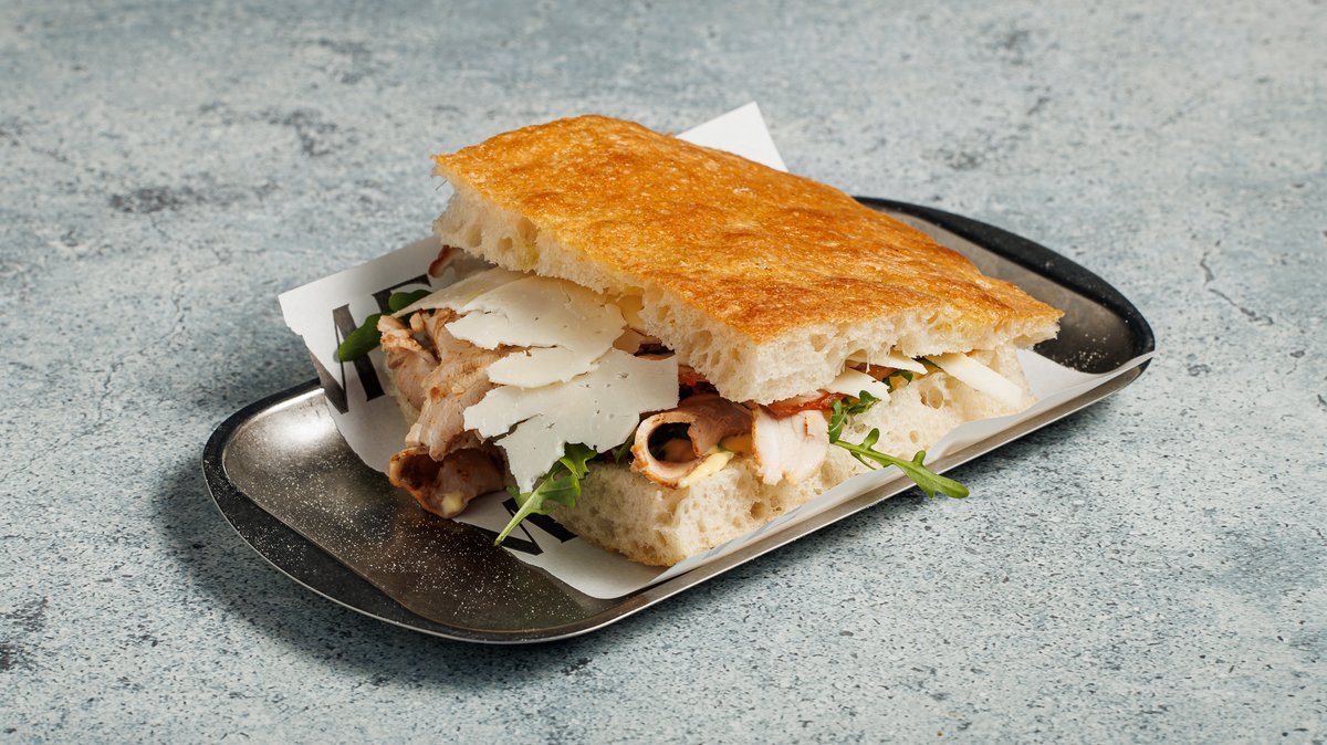 Με πορκέτα, provolone dolce, baby ρόκα και μαγιονέζα