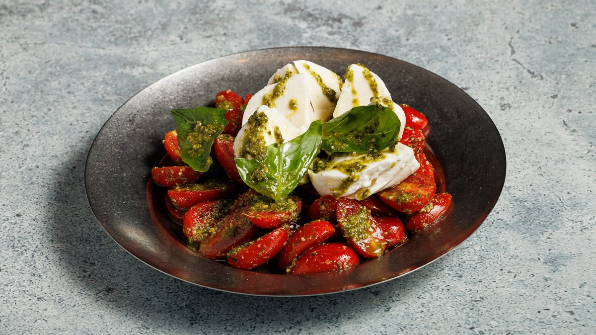 Σαλάτα με ντοματίνια, pesto βασιλικού, mozzarella και ελαιόλαδο