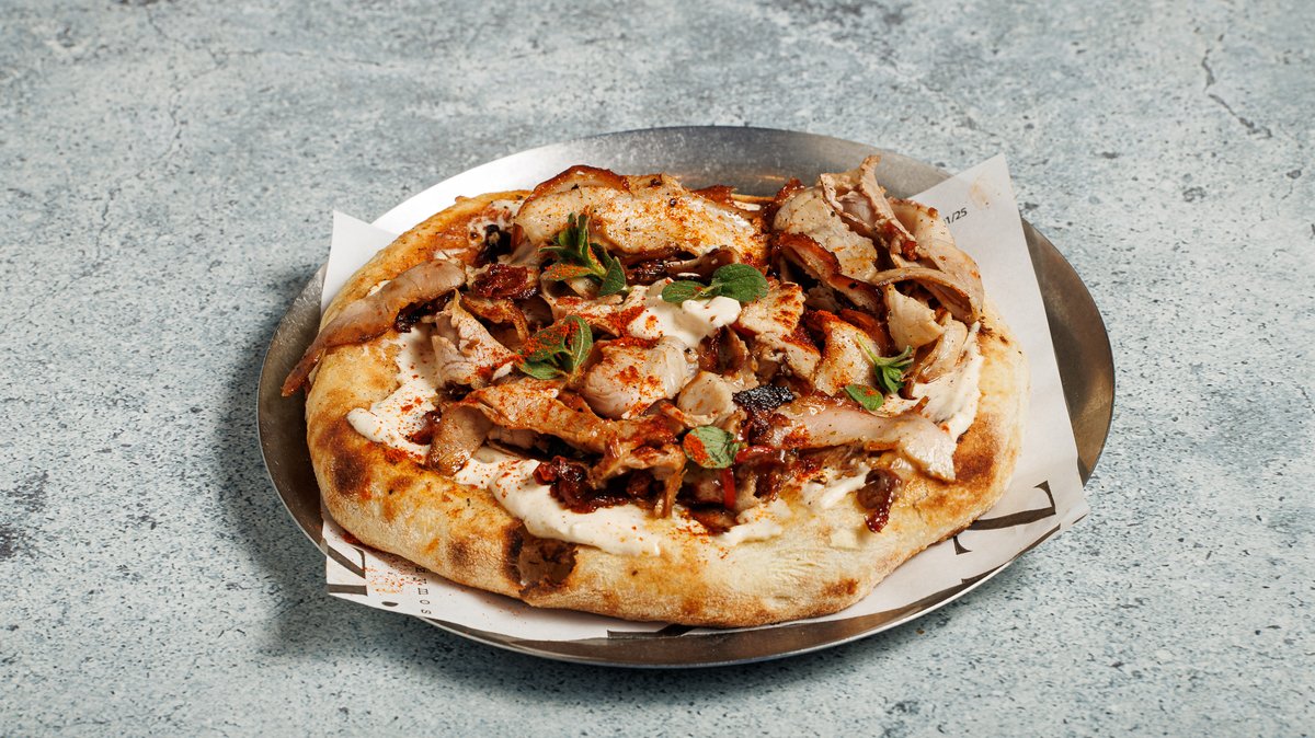 Ανοιχτή χειροποίητη πίτα με γουρουνόπουλα, κρέμα γιαουρτιού και ρίγανη