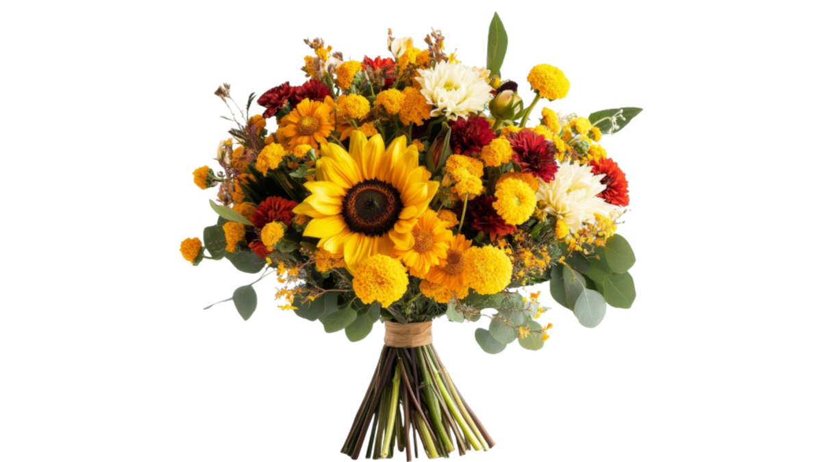 Μπουκέτο σε Πορτοκαλί και Κίτρινες Αποχρώσεις (Ηλίανθοι-Χρυσάνθεμα-Ζέρμπερα-Αλστρομέρια-Γυψοφύλλη-Πρασινάδα)
