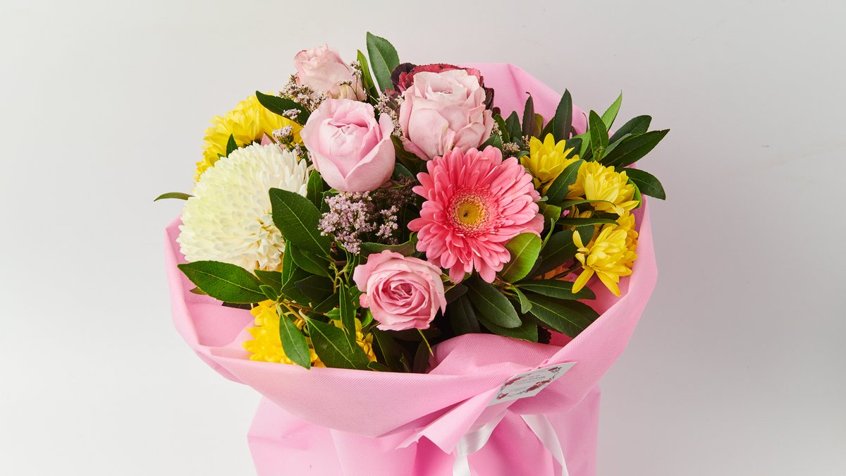 Μπουκέτο σε Ροζ και Κίτρινες Αποχρώσεις (3 Τριαντάφυλλα-Χρυσάνθεμα-Ηλίανθοι-Ζέρμπερες-Αλστρομέριες-Πρασινάδα)