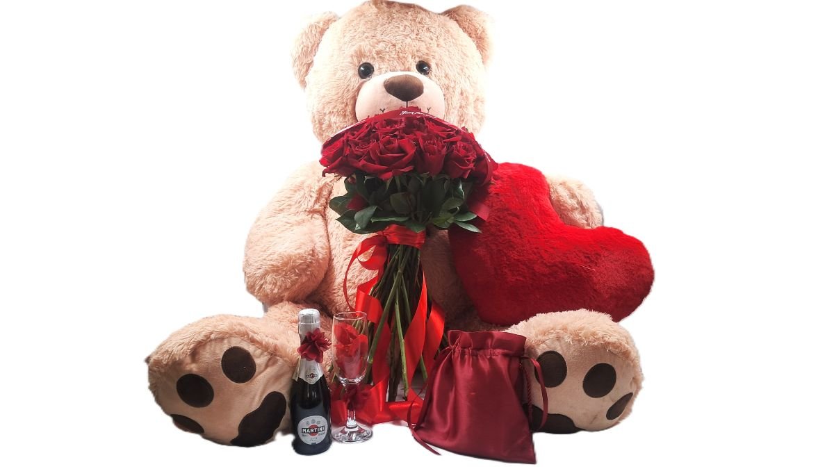 BEAR RED HEART WITH RED ROSES