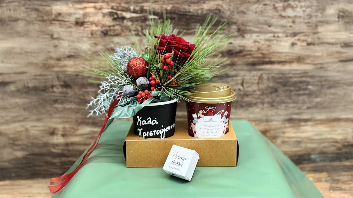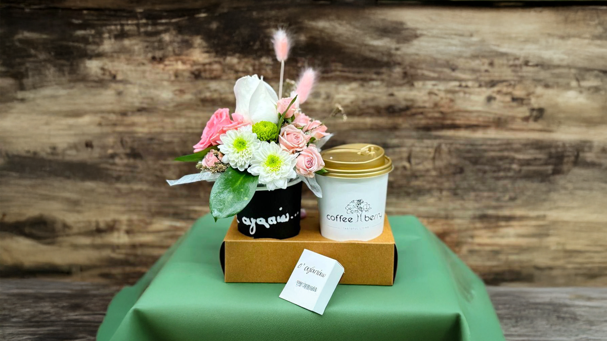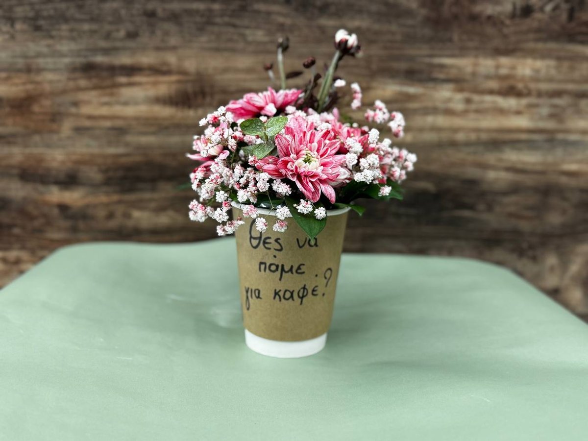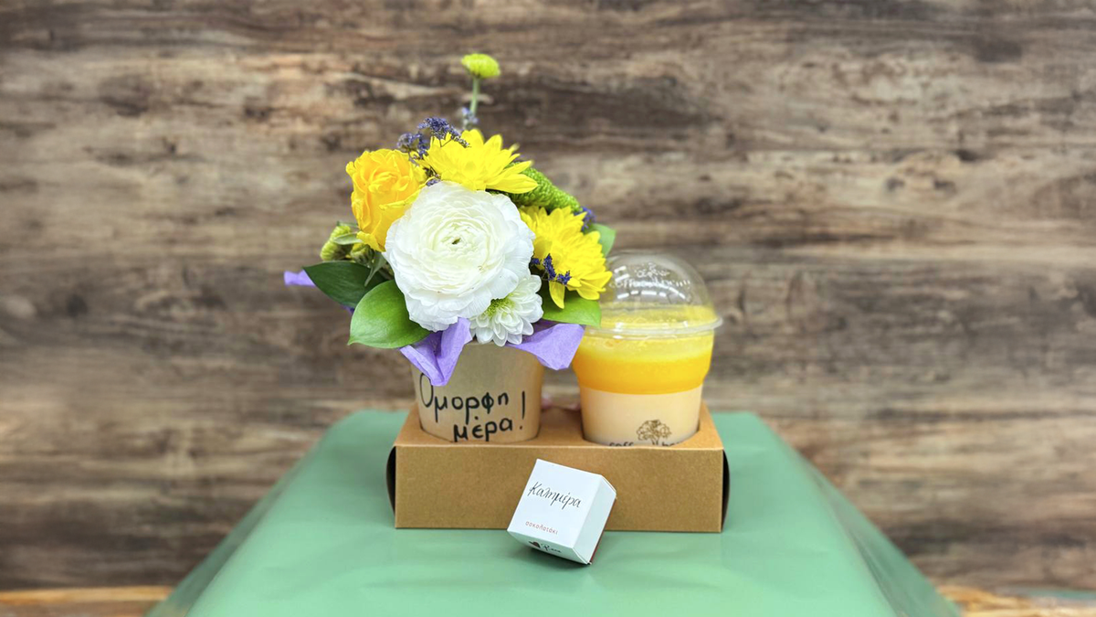 Ένα ρόφημα ή καφές ( Coffee Berry Αχαρνών 209) μαζί με ένα μίνι μπουκέτο σε ποτηράκι. Τα λουλούδια επιλέγονται από τα διαθέσιμα — μπορείτε να γράψετε τις προτιμήσεις σας στο χρώμα.