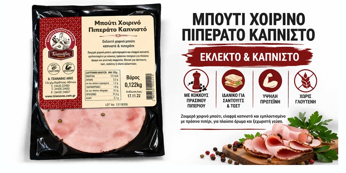 Ζαμπόν Καπνιστό Πιπέρι Πράσινο Μπούτι σε Φέτες Περ 130g Τσιανάβας