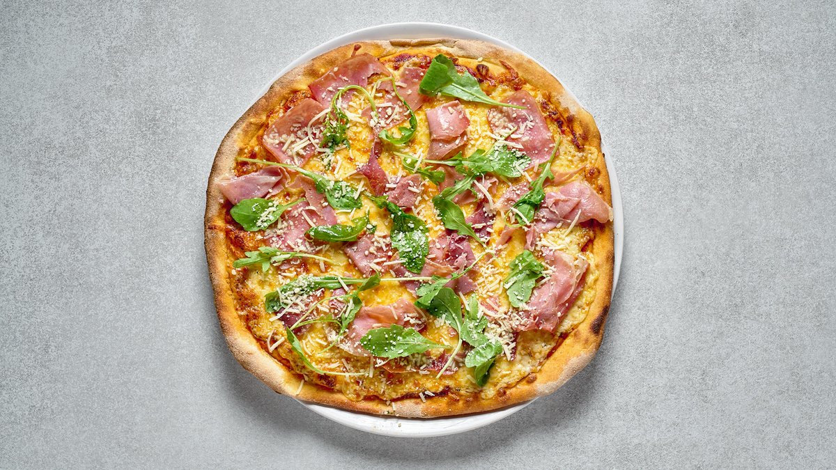 Με σάλτσα ντομάτας, τυρί gouda, μοτσαρέλα, ιταλικό προσούτο, παρμεζάνα και ρόκα