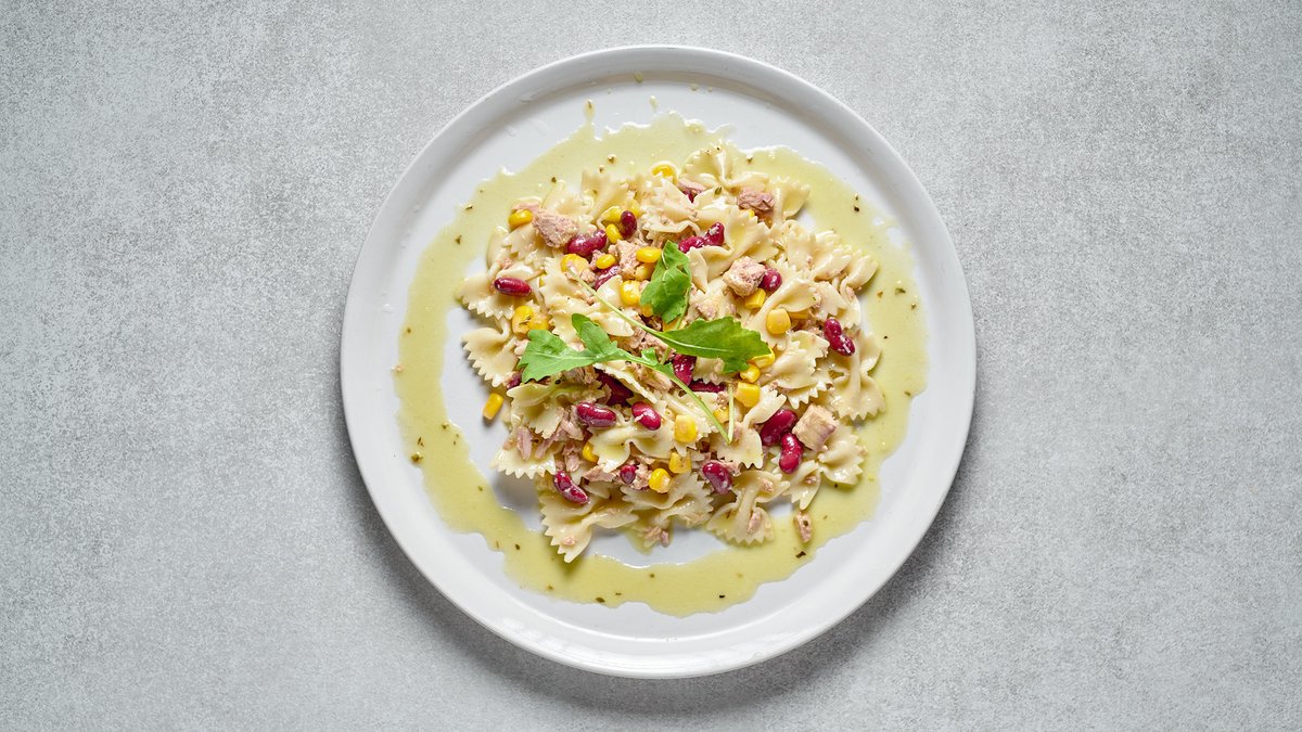 Σαλάτα με ζυμαρικά φαρφάλες, τόνο, καλαμπόκι, φασόλι κόκκινο και μαγιονέζα