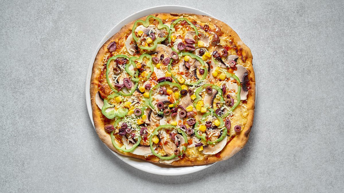 Με σάλτσα ντομάτας, τυρί gouda,μοτσαρέλα, μανιτάρια, πιπεριά, καλαμπόκι και ελιές