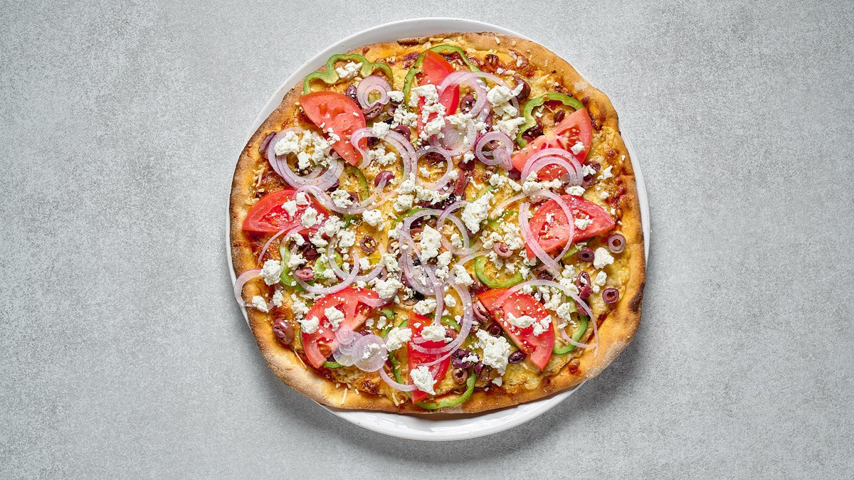 Με σάλτσα ντομάτας, τυρί gouda, μοτσαρέλα, φρέσκια ντομάτα, φέτα, κρεμμύδι, ελιές και πιπεριές