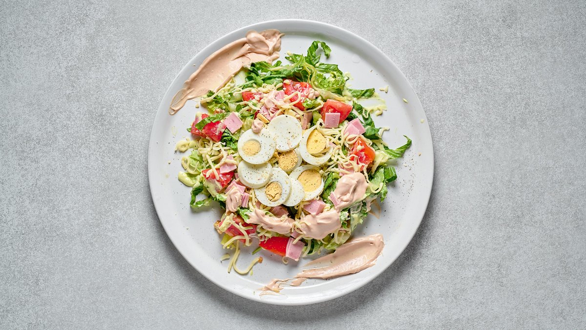 Σαλάτα με μαρούλι, ζαμπόν, gouda, ντομάτα ,αυγό και σως
