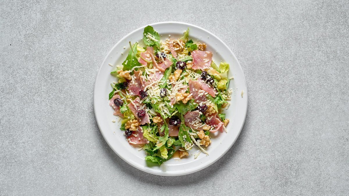 Σαλάτα με μαρούλι, μπέικον, ρόκα, καρύδι, cranberry, παρμεζάνα και vinaigette μελιού